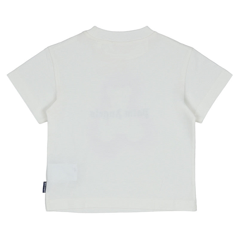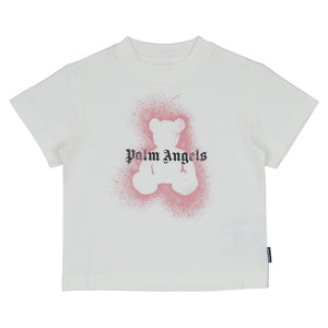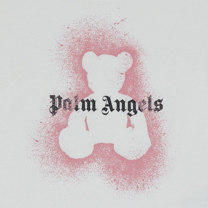 Ivory cotton T-shirt by Palm Angels combines casual comfort with cool design. Made in soft jersey, it has the brand's iconic bear motif in a pink spray paint effect, with a bold black logo across the front.