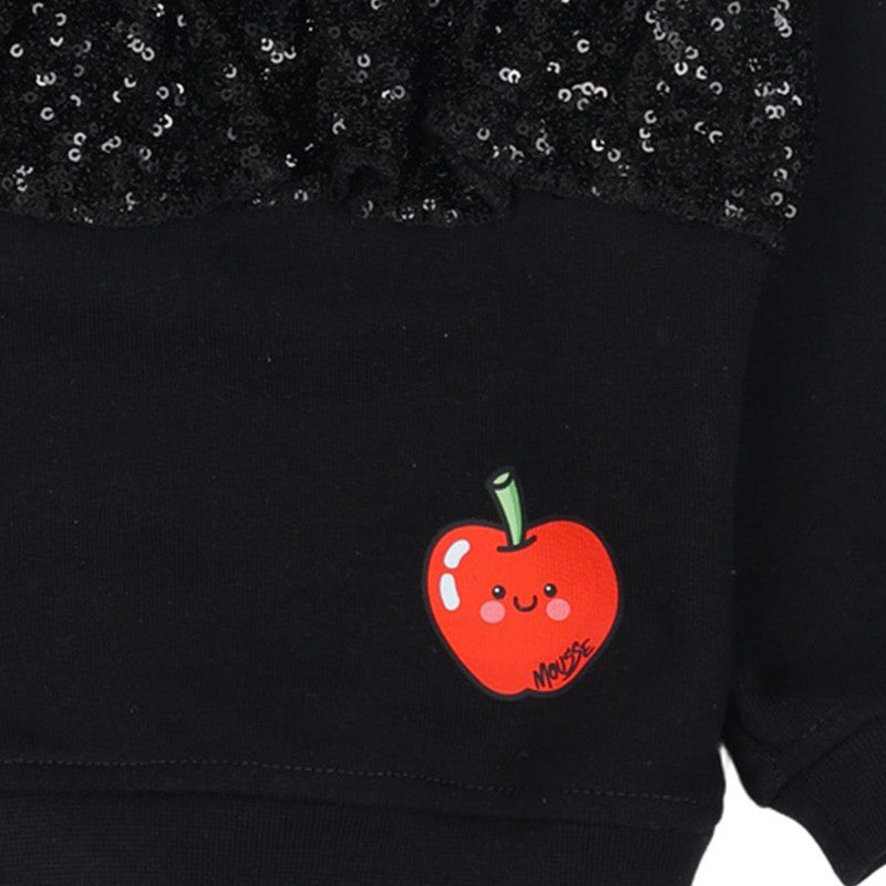 This stylish Mousse black sweatshirt features a cozy fleece interior, a playful embroidered apple graphic, and a horizontal band of dazzling black sequins across the chest.