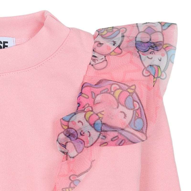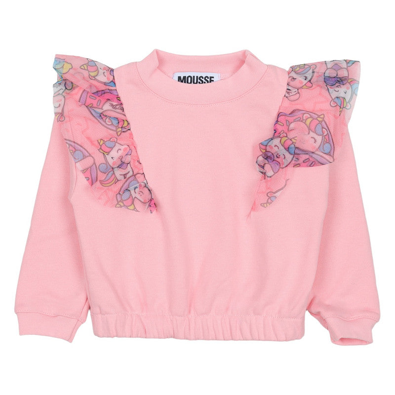 Add a touch of whimsy with this Mousse pink sweatshirt! It features soft ruffles on the shoulders with a playful, printed tulle overlay, combining style and cozy comfort.