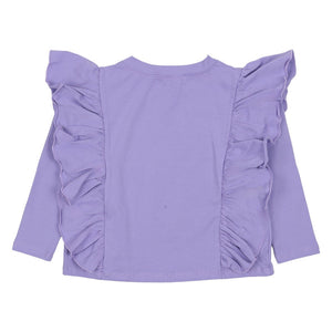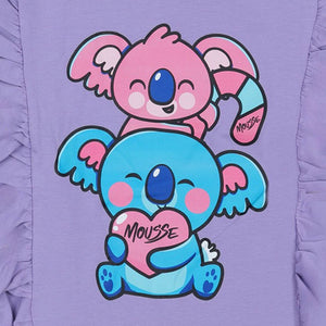Dress them in cuteness with this Mousse lilac top! It features an adorable stacked koala graphic and stylish, oversized shoulder ruffles, blending charm and comfort.