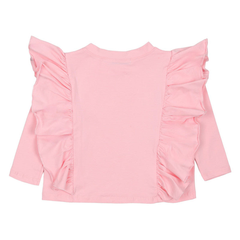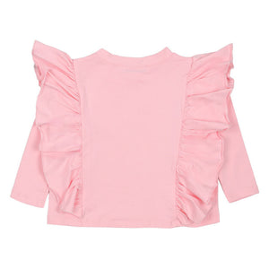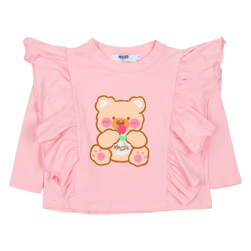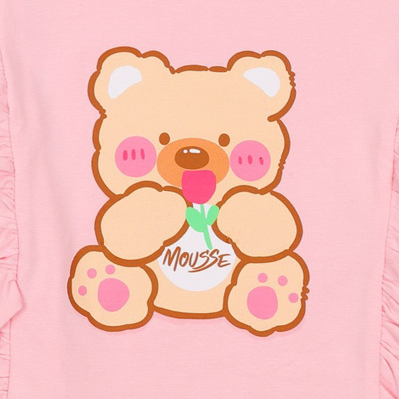 Snuggle up in style with this Mousse pink top! It features an adorable central teddy bear graphic and dramatic shoulder ruffles, combining sweetness with playfulness.