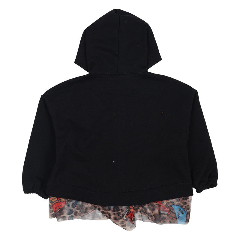Stay cozy with a fashionable twist in the Mousse Black Tulle Hem Hoodie! This zip-up features a fun leopard-print hood lining and a chic layered tulle skirt for unique style and warmth.