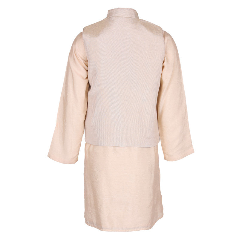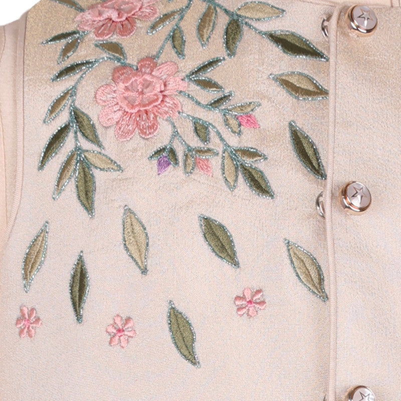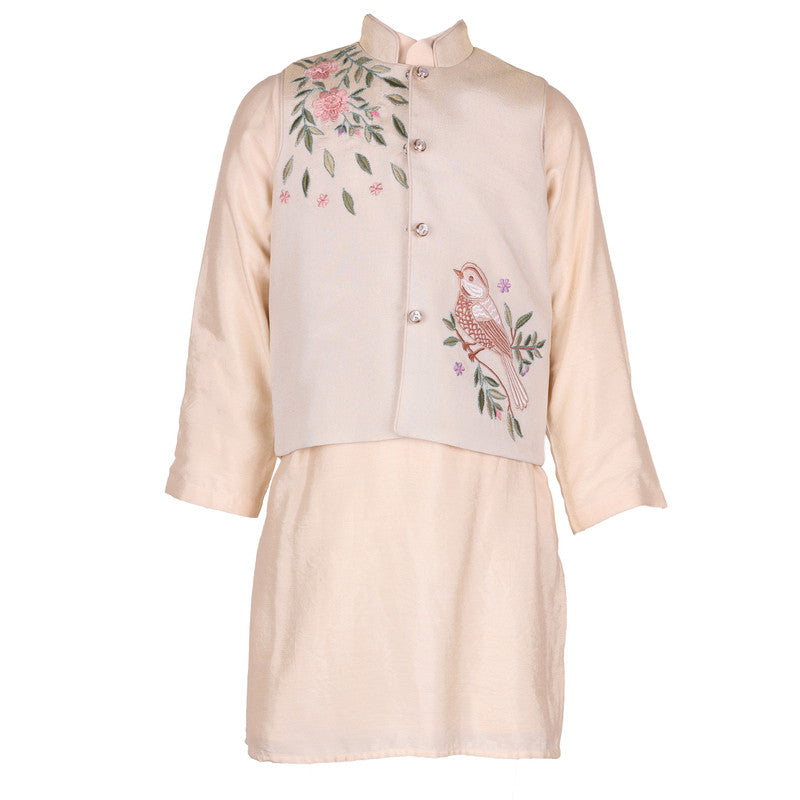 Dress your young gentleman in style with this Rang by Les Petits cream ethnic set. The ensemble features a crisp mandarin-collar kurta paired with a matching Nehru jacket. Intricate embroidery of a delicate bird and soft pink florals adds a touch of nature-inspired luxury, making it ideal for weddings and festive gatherings.
