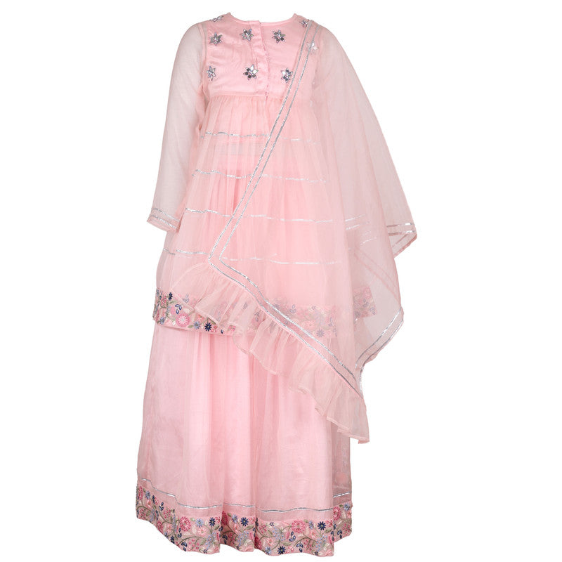 Drape your little one in elegance with this Rang by Les Petits baby pink Anarkali. Crafted from delicate net, it features a tiered skirt accented with silver gota patti, star-shaped bodice embellishments, and a floral embroidered hem. Complete with a ruffled dupatta and charming latkans, it's perfect for festive celebrations