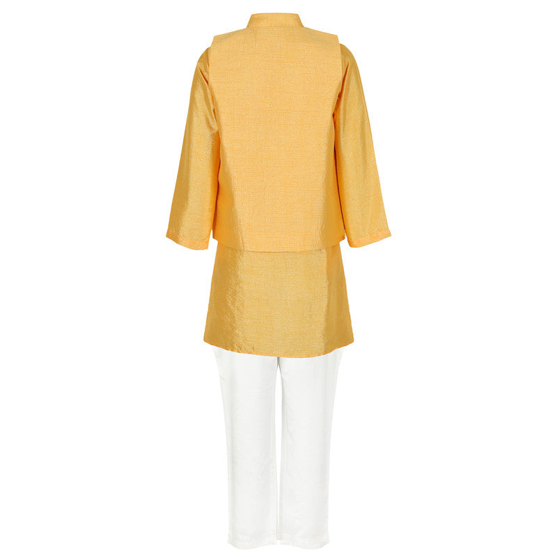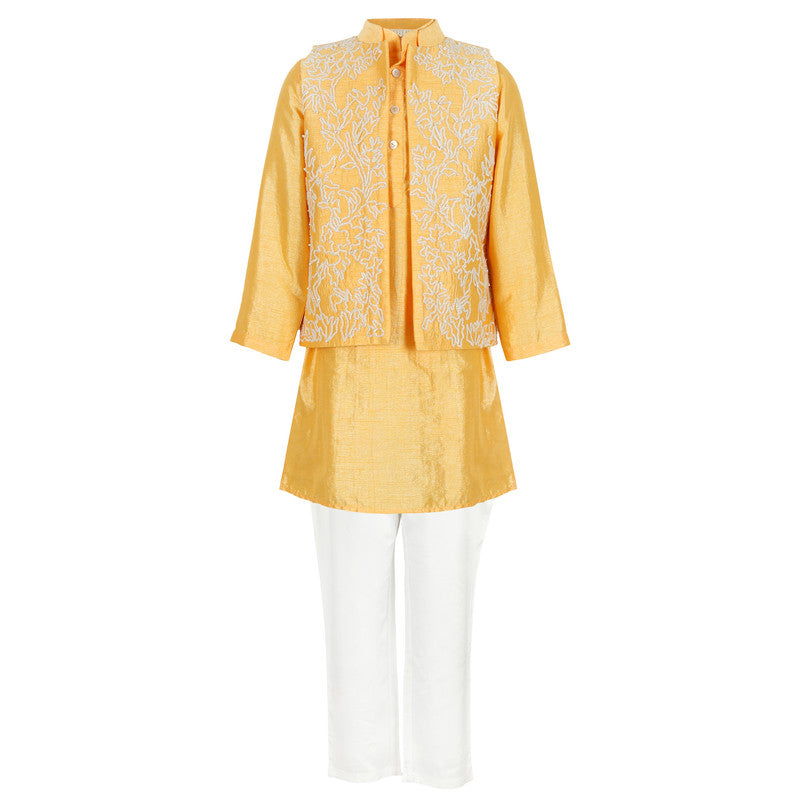 This striking Yellow Kurta Pajama set is designed for grand occasions. The jacket is adorned with intricate all-over sequin and beadwork, ensuring a radiant and unforgettable look for any celebration.
