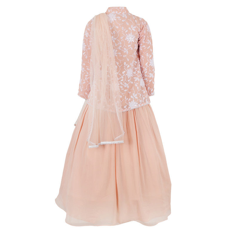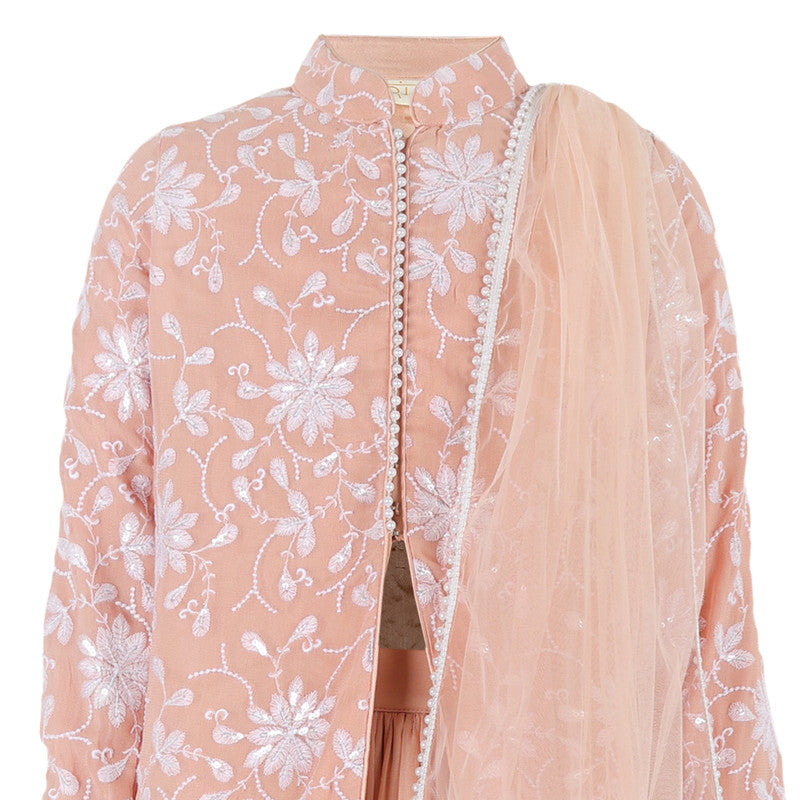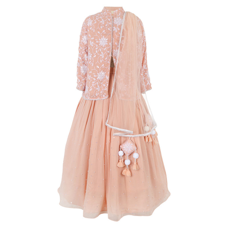 Elegant peach lehenga set featuring a short jacket with all-over intricate white floral threadwork. Finished with a charming tassel detail on the skirt and dupatta.