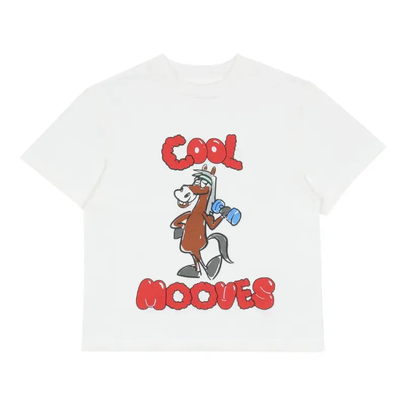 From Stella McCartney Kids, a white organic cotton T-shirt for boys. Made in soft and comfortable jersey, it has a fun horse character print, with the words 'Cool Mooves' in red bubble letters. It is designed with a casual, relaxed fit, short sleeves and a ribbed crew neck.