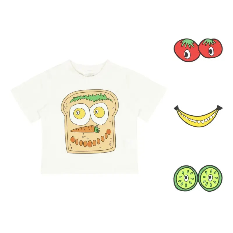 An ivory T-shirt for boys by Stella McCartney Kids, made in soft organic cotton jersey. Casually styled with a lightly ribbed crew neck and short sleeves, it has a fun vegetable face print on the front. For a playful touch, the top comes with detachable velcro patches, to cleverly change the expression of the face. When not in use, they can be secured in a concealed side pocket. The Stella McCartney fit can be quite small so choose a size up if you want room to grow.