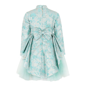 Elegant aqua-blue jacket dress crafted from floral jacquard brocade. The high-low peplum jacket and standing collar create a dramatic, regal silhouette.