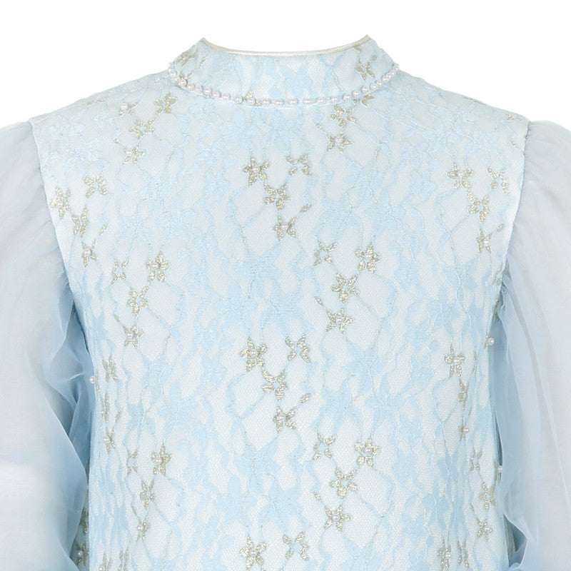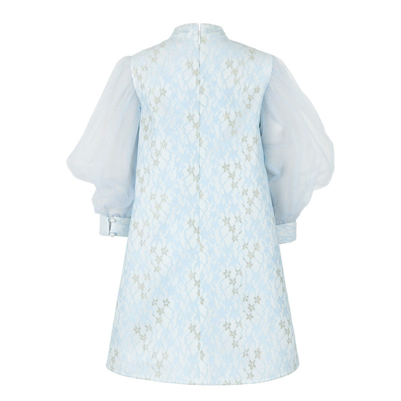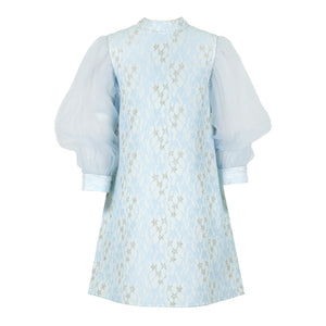 Dreamy light blue dress featuring a lace-effect jacquard pattern with subtle gold accents. The voluminous sheer organza sleeves add a touch of playful drama.