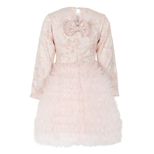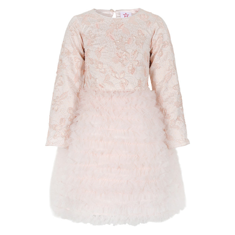 Dreamy blush pink dress featuring an intricately embroidered bodice with a voluminous skirt of delicate, cascading ruffles. Perfect for a fairy-tale look.