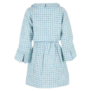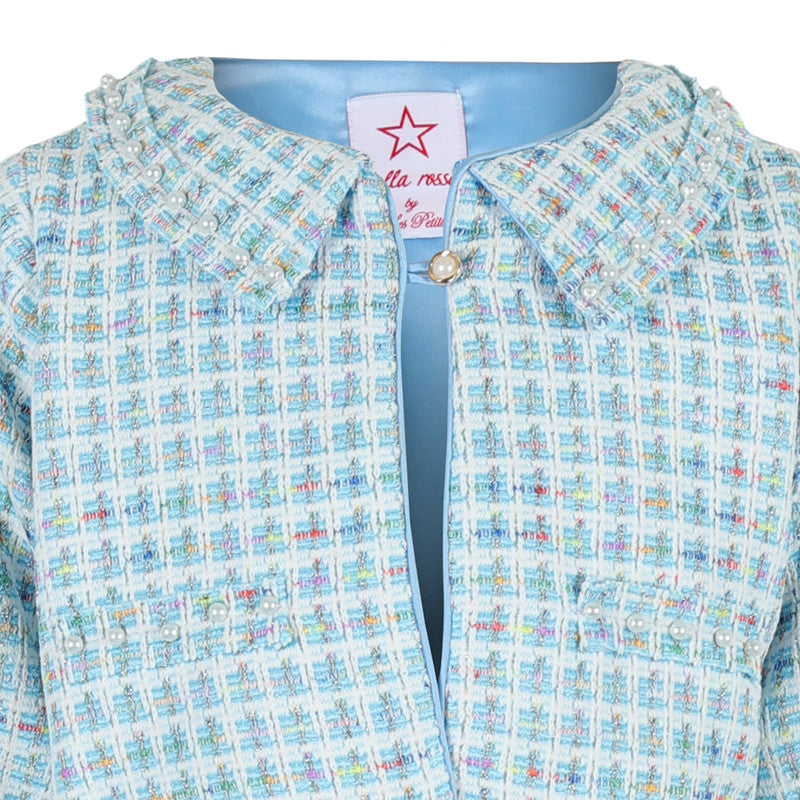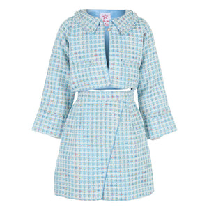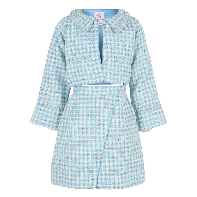 Chic light blue tweed set featuring a cropped jacket with a structured collar and a matching wrap-style skirt. The multicolored weave is highly sophisticated.