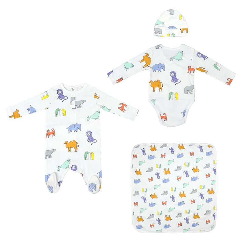 Share the Stella love with baby with this striking gift set. Presented in a Stella McCartney Kids box, the set features ta sleepsuit, bodysuit, jersey hat and blanket, each elevated with pastel animal prints. The set is entirely made from GOTS-certified organic cotton responsibly sourced and grown without pesticides or harmful chemicals.