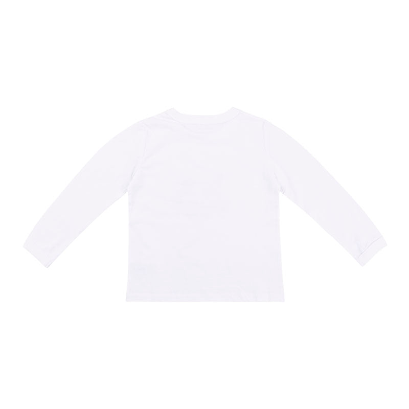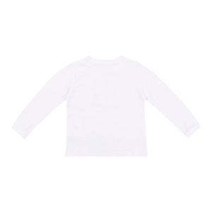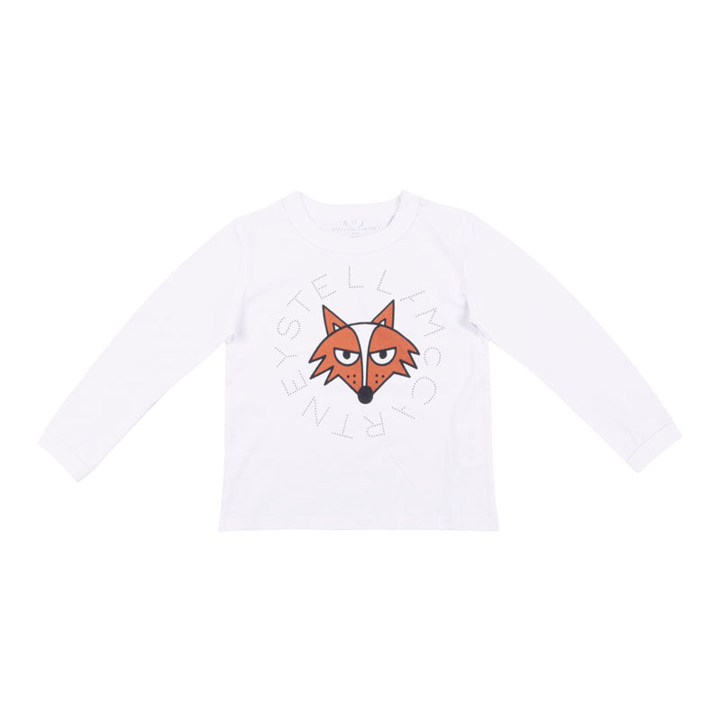 White long-sleeved top for boys from Stella McCartney Kids, with a brown fox and grey logo print on the front. Made in soft and comfortable organic cotton jersey, it has ribbed trim on the crew neck and cuffs.