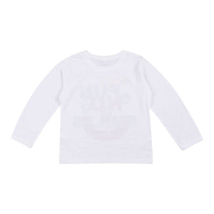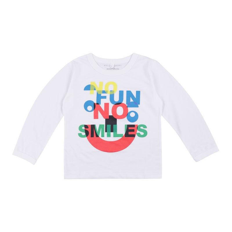 White top for boys by British label Stella McCartney Kids, made in soft organic cotton jersey. Easy to wear, this long-sleeved top has a fun, colourful slogan print on the front. It has narrow ribbed cuffs and a rounded neckline for added comfort.