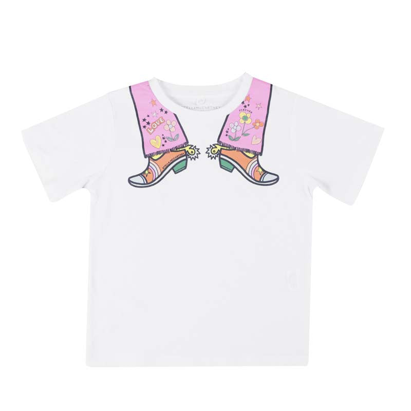 Casual ivory T-shirt for girls by Stella McCartney Kids. It has a colourful cowboy boot print on the front, with small logo lettering for a subtle designer touch. Made in soft organic cotton jersey, it is easy and comfortable for wear.