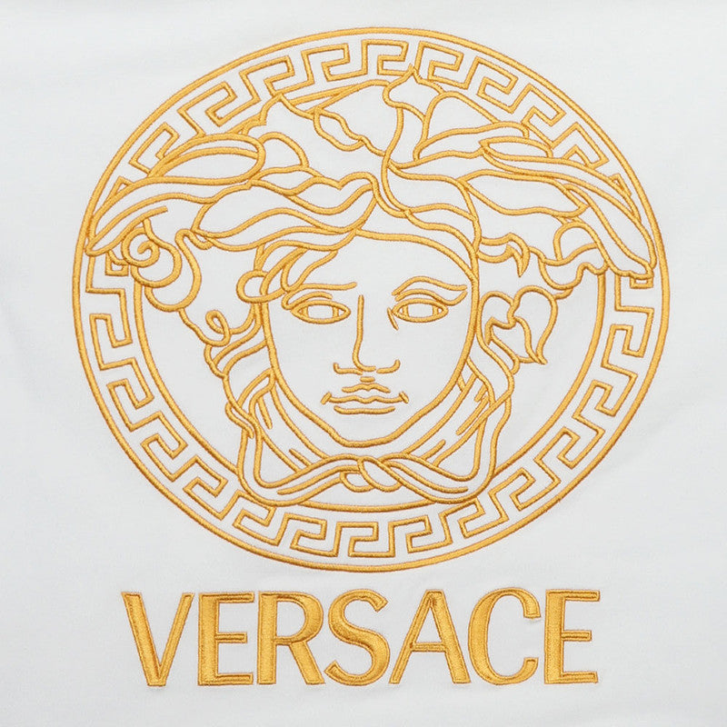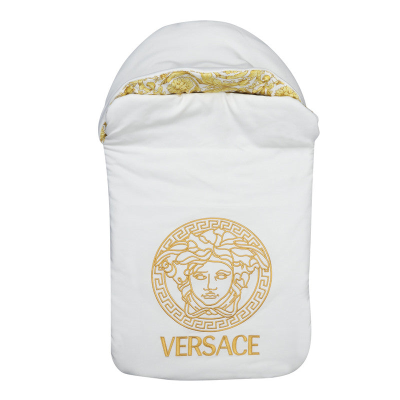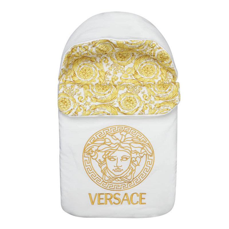 White and gold cotton nest for baby girls and boys by Versace. Luxuriously soft and lightly padded for comfort, it is designed with an embroidered Medusa motif and Barocco-patterned lining, adding those signature designer details.