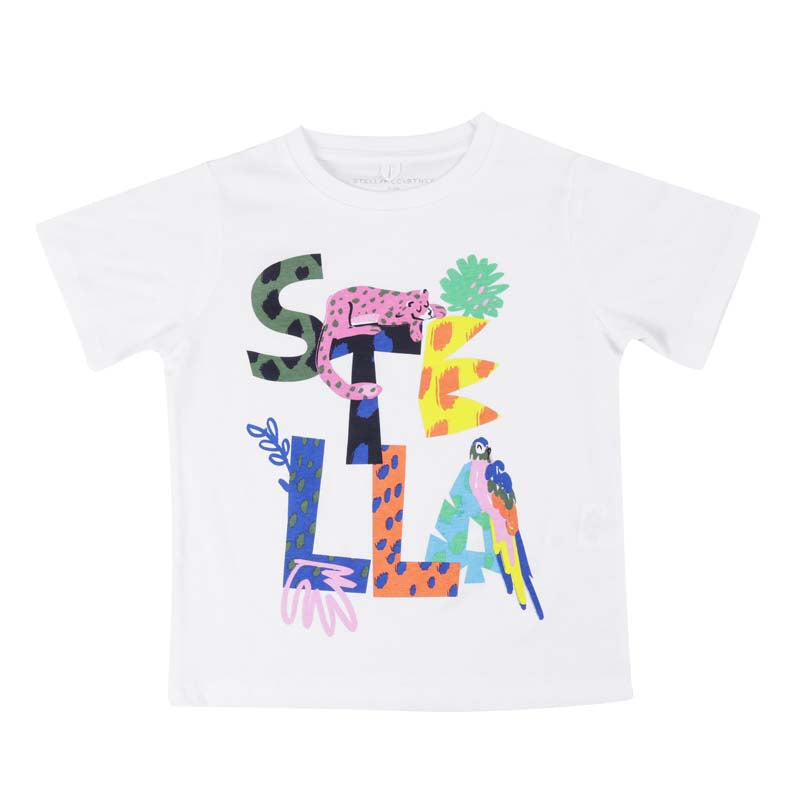 Lovely white T-shirt for girls by Stella McCartney Kids, made in soft organic cotton jersey. The front is printed with a quirky logo print, inspired by bright colours and jungle animals.
