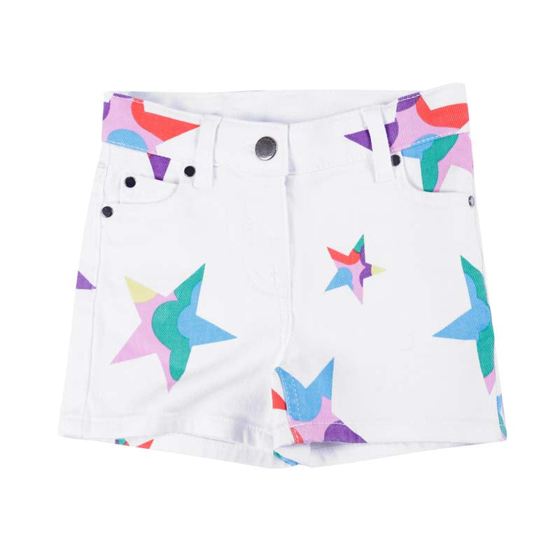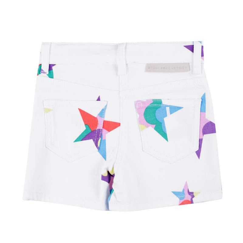 White denim shorts for girls by Stella McCartney Kids, with a colourful patterned star print. Made with organic cotton, they have a slight stretch for comfort and classic five-pocket styling. They fasten with a zip and hook and have an adjustable waist for a great fit. Branded metalware and a faux leather logo patch on the back give a discreet designer finish. The Stella McCartney fit can be quite small so choose a size up if you want room to grow.